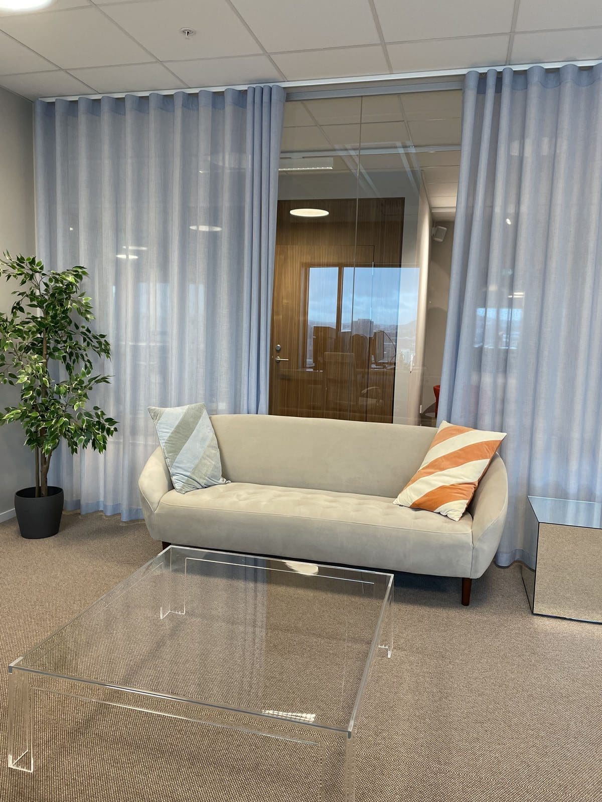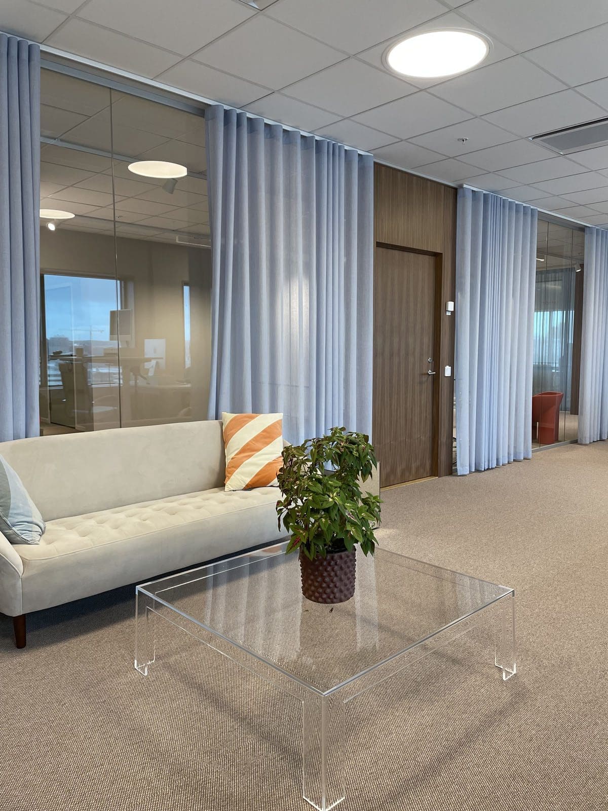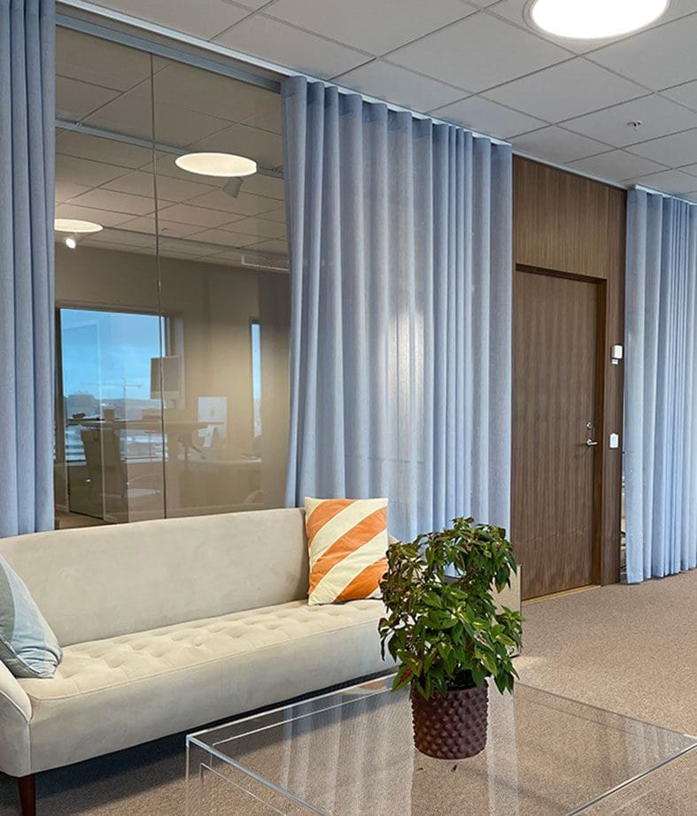 Genom att välja en ljus gardin till kontoret skapades en trivsam avskärmning i kontorslandskapet utan att ljuset försvann. Kunden önskade att det nybyggda kontoret skulle upplevas ljust och öppet, men där det fanns möjlighet till smidig avskärmning. Det var även viktigt att det skulle vara estetiskt tilltalande och att färgen skulle matcha deras företagsprofil samt logotyp. Därför föll valet på väven Titles i ljusblått. En transparent väv med fin struktur.