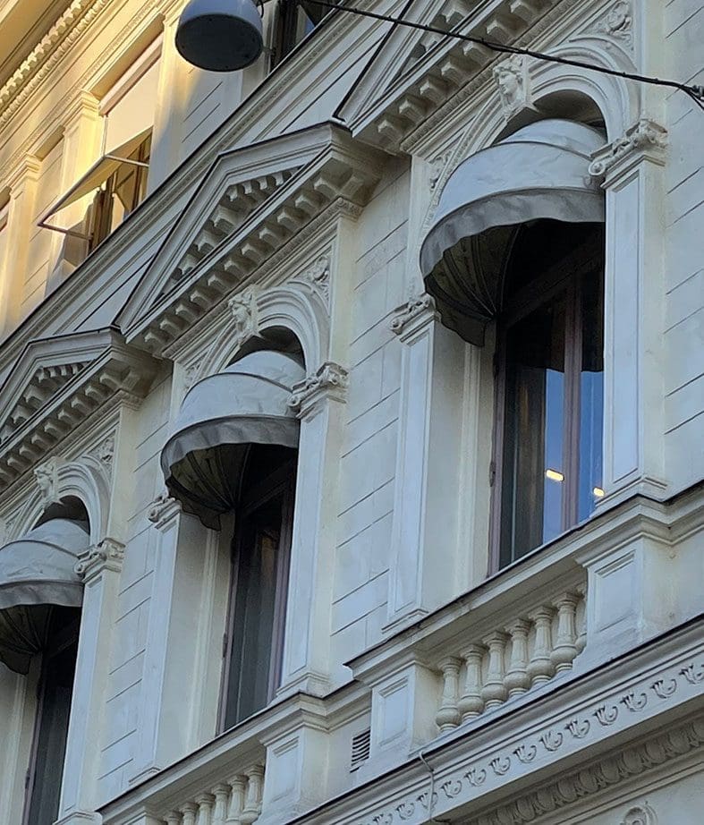 Till en äldre fastighet i centrala Göteborg önskades ett diskret solskydd. Lindhs Rollo föreslog en korgmarkis i liknande nyans som fasaden så att solskyddet smälter in. Till den översta våningen valdes Markisolett som passar höga och smala fönster. Den löper vertikalt ned över fönstret för att därefter vinklas utåt.